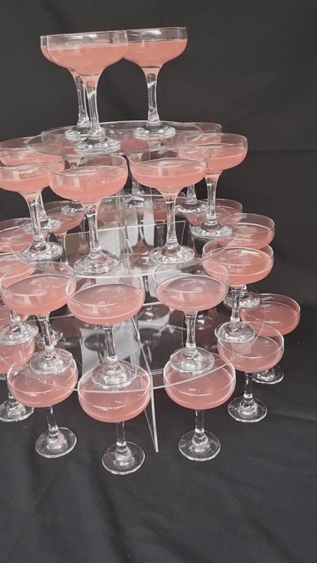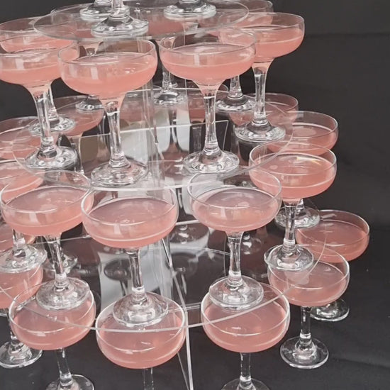 4 TIER STANDARD SIZE FOR 34 GLASSES (Table & 3 Tiers Above) This stand is for cocktail or coupe style glasses and holds 22 glasses with an additional 12 glasses under the bottom tier giving room for 34 glasses. Measurements: 42cm High 14cm between each tier. Bases measure 45cm, 35cm and 25cm in diameter. Bottle and glasses are not included.
