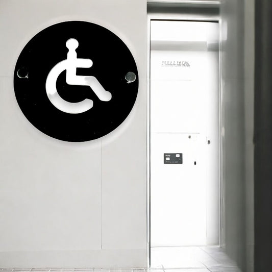 Panneaux de toilettes pour handicapés ronds ou carrés - Couleurs et finitions bois personnalisées, libellés, tailles et formes personnalisés