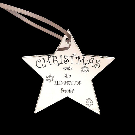 Décorations de sapin de Noël gravées « Noël en famille » personnalisées en forme d'étoile, effet miroir