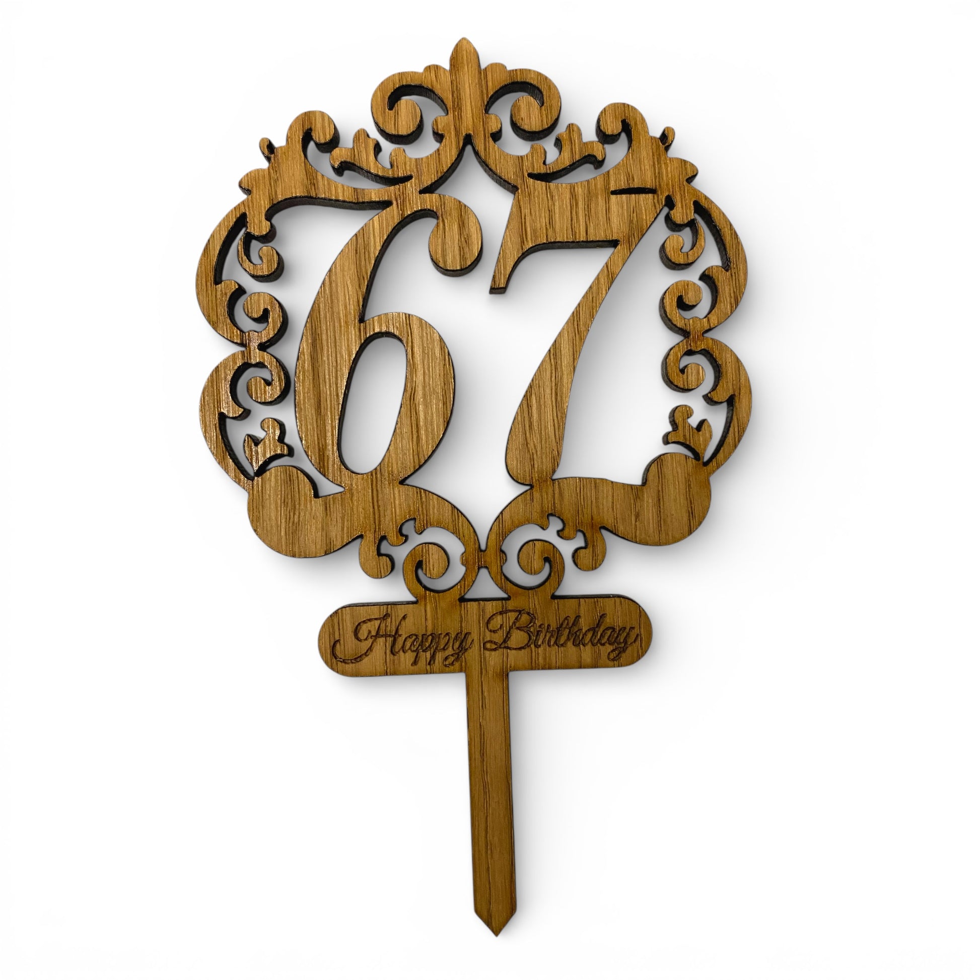 A laser cut cake topper made from 3mm shatter proof acrylic or 4mm veneered wood.