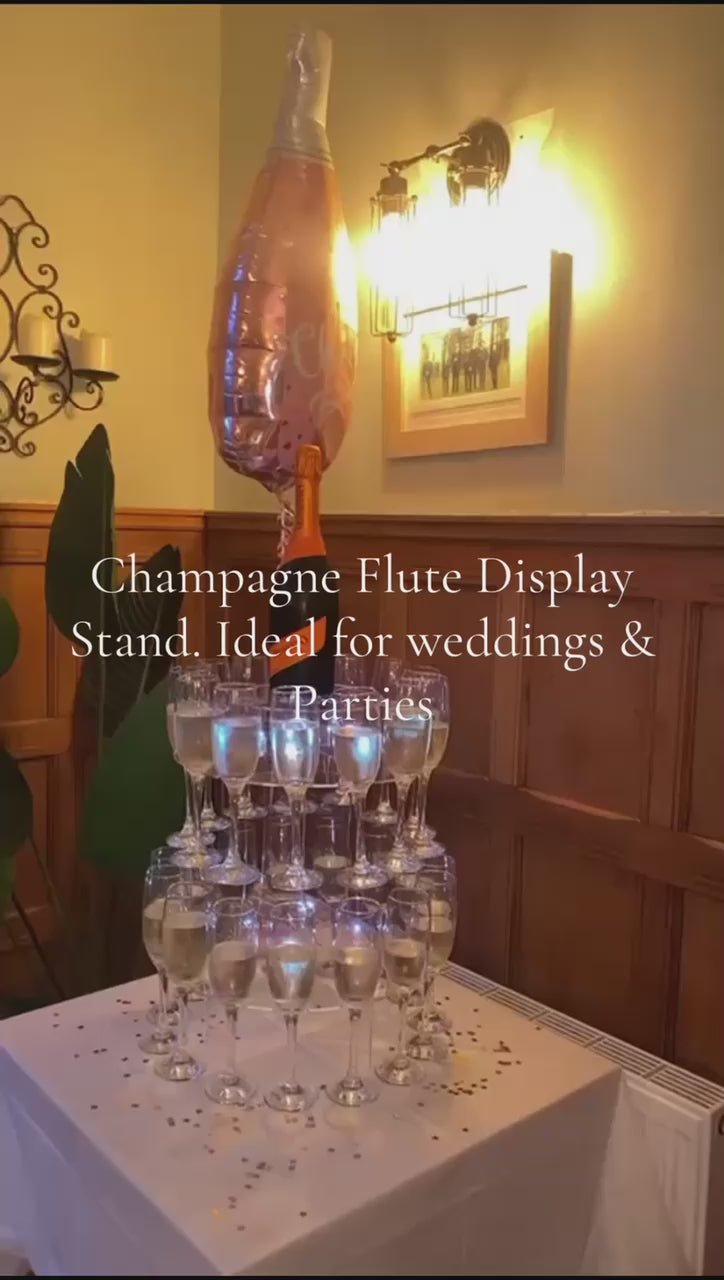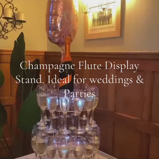 Our Champagne and glasses display stand is laser cut from 3mm clear acrylic. Perfect for weddings and parties to hold a bottle of champagne or prosecco and either 12 or 28 glasses.