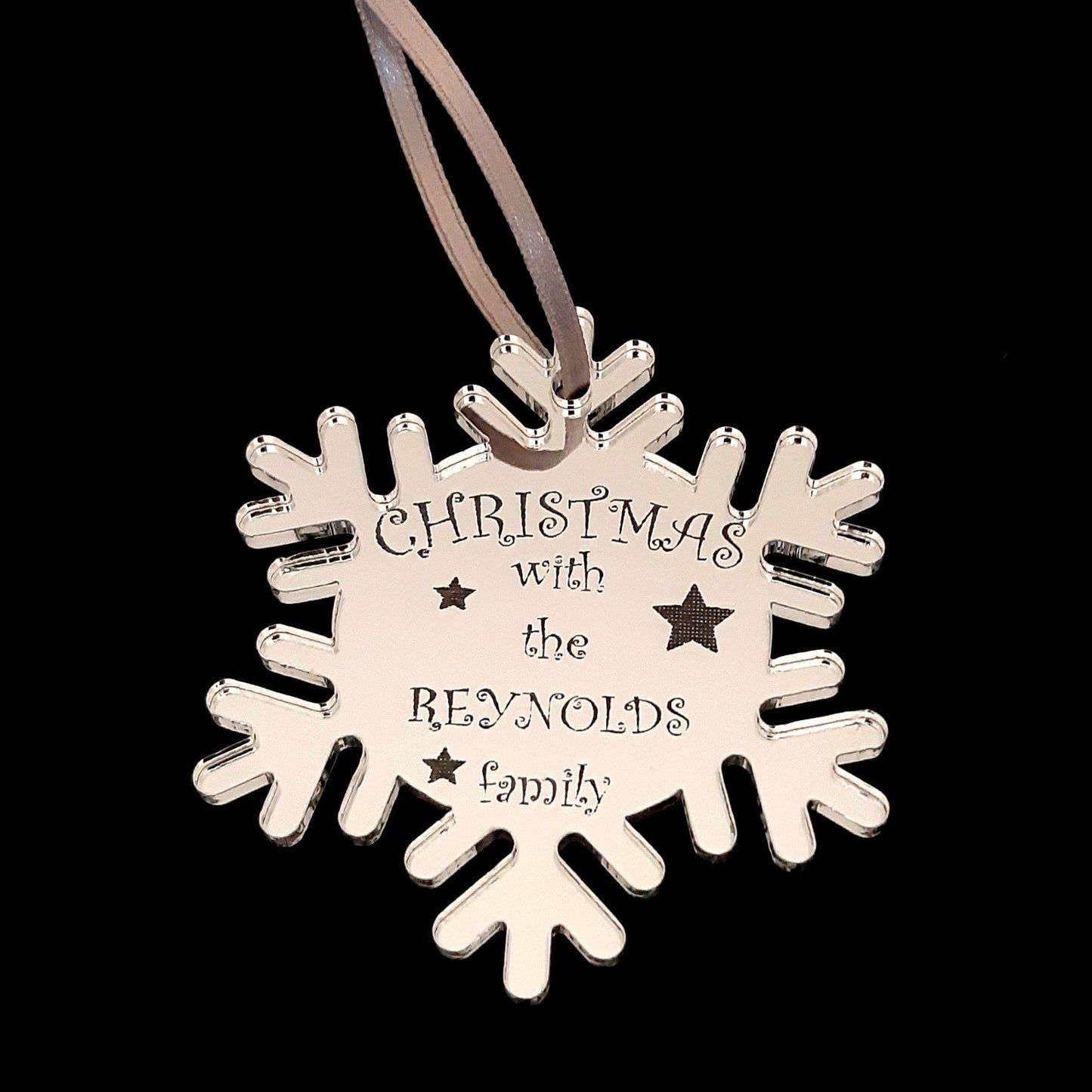 Snowflake Bespoke "Christmas with the Family" Engraved Christmas Tree Decorations Mirrored